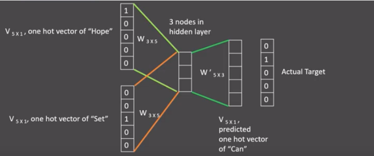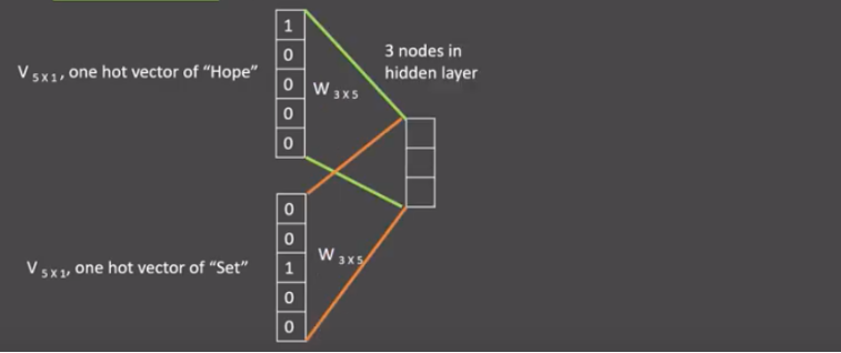 - 假设我们给定的训练语料只有一句话: Hope can set you free (愿你自由成长),窗口大小为3,因此模型的第一个训练样本来自Hope you set,因为是CBOW模式,所以将使用Hope和set作为输入,you作为输出,在模型训练时, Hope,set,you等词汇都使用它们的one-hot编码. 如图所示: 每个one-hot编码的单词与各自的变换矩阵(即参数矩阵3x5, 这里的3是指最后得到的词向量维度)相乘之后再相加, 得到上下文表示矩阵(3x1).