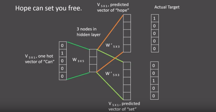 假设我们给定的训练语料只有一句话: Hope can set you free (愿你自由成长),窗口大小为3,因此模型的第一个训练样本来自Hope can set,因为是skip-gram模式,所以将使用can作为输入,Hope和set作为输出,在模型训练时,Hope、can、set等词汇都使用它们的one-hot编码。如图所示: 将can的one-hot编码与变换矩阵(即参数矩阵3x5, 这里的3是指最后得到的词向量维度)相乘, 得到目标词汇表示矩阵(3x1)。