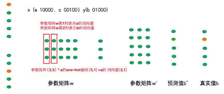 如下图所示:a的onehot编码[10000],用参数矩阵[3,5] * a的onehot编码[10000],可以把参数矩阵的第1列参数给取出来,这个[3,1]的值就是a的词向量。