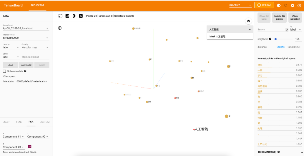 Bash# 进入保存runs文件夹的目录路径下,执行以下shell命令 tensorboard --logdir=runs --host 0.0.0.0 # 通过http://127.0.0.1:6006访问浏览器可视化页面,打开网页后需再次刷新网页才能展示。浏览器展示并可以使用右侧近邻词汇功能检验效果: