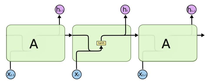 我们把目光集中在中间的方块部分,它的输入有两部分:分别是\(h_{t-1}\)以及\(x_t\),代表上一时间步的隐藏层输出以及此时间步的输入。它们进入RNN结构体后,会”融合”到一起,这种融合我们根据结构解释可知是将二者进行拼接,形成新的张量[\(x_t\), \(h_{t-1}\)]。之后这个新的张量将通过一个全连接层(线性层),该层使用tanh作为激活函数,最终得到该时间步的输出\(h_t\),它将作为下一个时间步的输入和\(x_{t+1}\)一起进入结构体。以此类推…