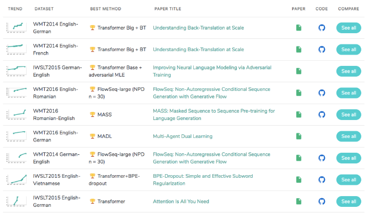 在著名的SOTA机器翻译榜单上, 几乎所有排名靠前的模型都使用Transformer。