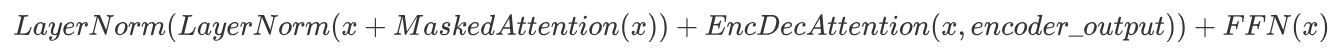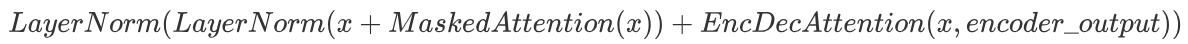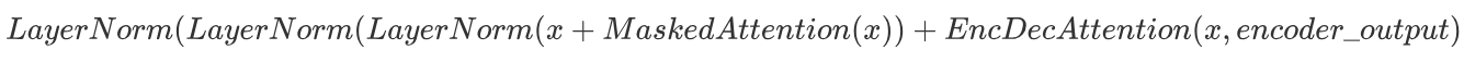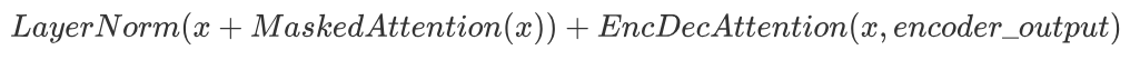 - 将多头编码器-解码器注意力的输入(即上一层输出)与输出 \(EncDecAttention(x, encoder\_output)\) 相加,形成残差连接: