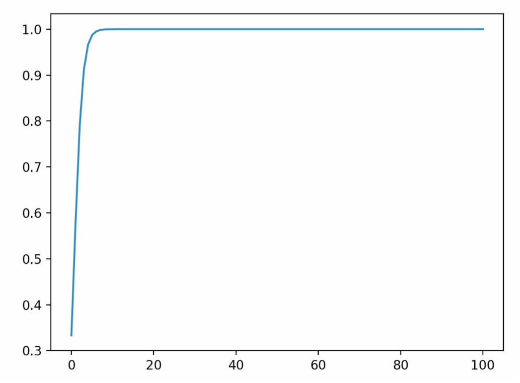 a = 10时, y3 = 0.9999092083843412 # e^20 / (e^10 + e^10 + e^20))