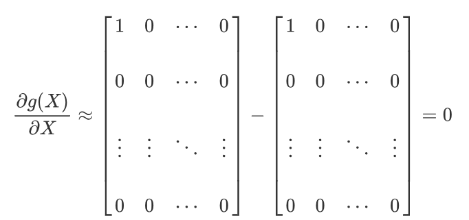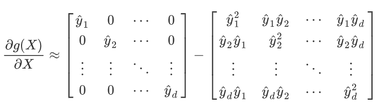 根据第一步中的讨论结果, 当输入x的分量值较大时, softmax函数会将大部分概率分配给最大的元素, 假设最大元素是x1, 那么softmax的输出分布将产生一个接近one-hot的结果张量y_ = [1, 0, 0,…, 0], 此时结果矩阵变为: